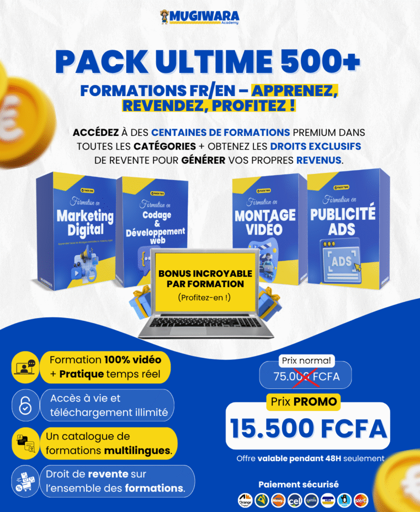 Chaque pack contient aussi des ressources et des bonus utiles pour t’aider à apprendre plus vite. Et sur certaines formations, tu as même le droit de revente, pour pouvoir les proposer à ton tour.