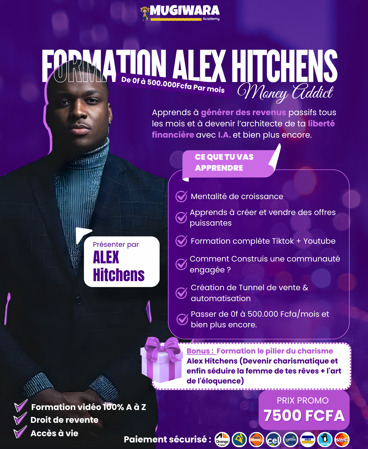 En bonus, tu reçois un module exclusif : Le pilier du charisme Alex Hitchens, un programme unique qui t’apprend à devenir plus charismatique, développer une présence magnétique et améliorer ton éloquence — des qualités indispensables pour séduire, convaincre et réussir dans le business comme dans la vie ⭐🎤.